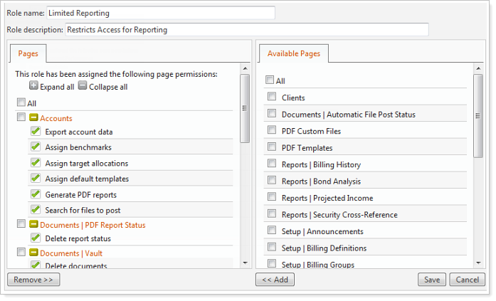 Under Available Pages, click the pages you want to grant to the role and then click Add. When adding a page, read only permissions for the page are granted by default. Full control permissions are defined by the check boxes below the page names.