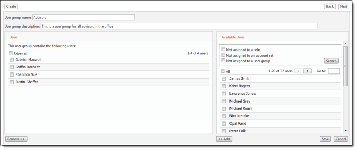 Under Available Users, select the users you want to add to the group and then click Add.
