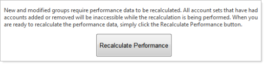 In most cases, setting up user groups and account sets will require you to recalculate performance data. When you make a change to a user group or account set, a Recalculate Performance button will appear on the Wizard Summary page of the Permissions Wizard. To recalculate performance, simply click the Recalculate Performance button. All account sets that have had accounts added or removed will be inaccessible while the recalculation is being performed.