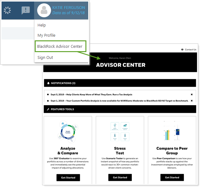 To access the BlackRock Advisor Center from Tamarac, hover your mouse over your name at the top of the page and click BlackRock Advisor Center.