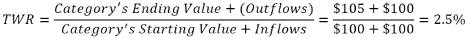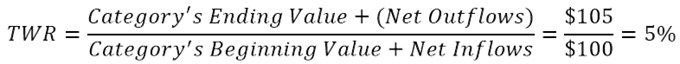 To ensure that return numbers within categories make the most sense, we now consider buys and sells within a security category on the same day to happen simultaneously. This means that the flows associated with buy and sell transactions that occur on the same day are aggregated together. Then the net value is applied to the interval flow at either the beginning or the end of day.