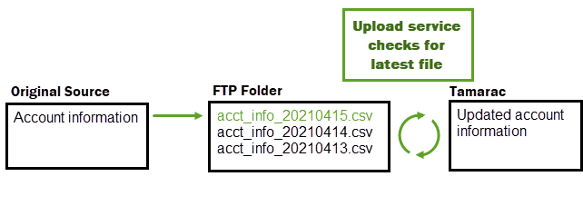 To schedule an automatic upload, work with your Tamarac Support team. You can choose the days, times, and frequency for uploads to fit your needs. Once configured, upload files by saving them to your FTP folder using a designated naming pattern.