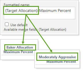 To identify which target allocation is assigned to the account or group, add the {Target Allocation} merge field to the column name. This field dynamically displays the name of the target allocation assigned.
