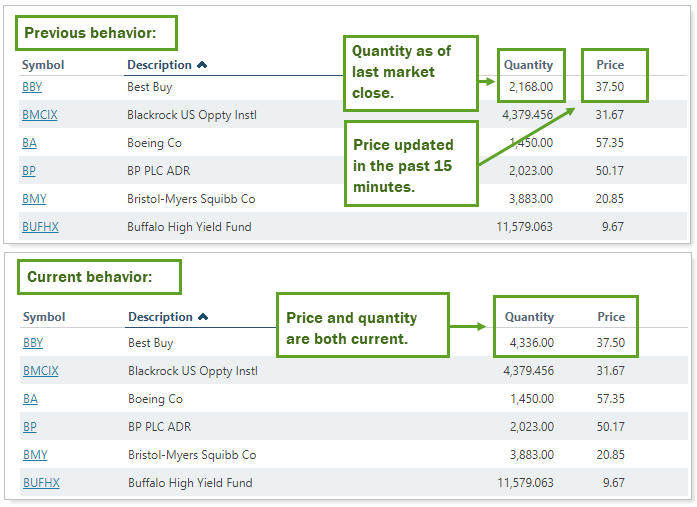 Intraday pricing allows you to see up-to-date security prices within 15 minutes. However, intraday pricing does not include security quantity data. In some rare stock split situations, firms using this feature noticed that the Holdings report showed quantity data from the day before the split and price data from the current day.