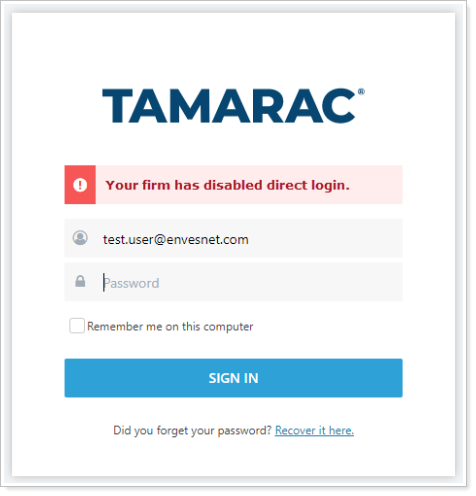Depending on your firm’s needs, you can choose to require SSO for advisors, clients, or for both. When this option is enabled, users who attempt to sign in directly will see the following warning message: