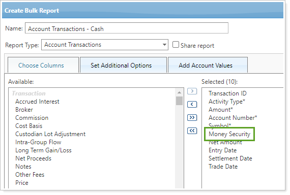 To track money securities in bulk, add the Money Security column to an Account Transactions bulk report. For more information, see Run a Bulk Report to Export Data in Bulk.
