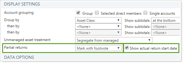 Partial Returns: Add transparency to your reports when you use this setting to designate how the PDF report marks positions that have a partial period return.