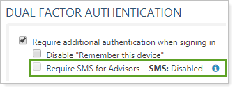 must log in with SMS authentication.Require SMS for Advisors allows administrators to control whether advisors or other users in a firm must use SMS authentication for every log in or to employ the DFA method of their choice. Firm administrators who want added security can enable this option to require users to enter the SMS authentication code instead of challenge questions.