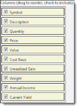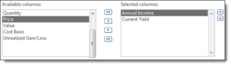 To add annual income to the report, select the Annual Income check box. To add the current yield to the report, select the Current Yield check box.