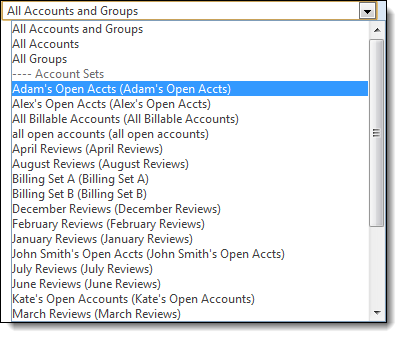 After you've synchronized data, click Accounts in Advisor View. The sets appear in the View list. Simply click the set you want to view and Advisor View only shows the accounts associated with the set.