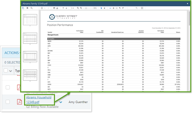 Preview adds a new level of security and convenience to document vault. You can simply click the file name to open a preview of the document right within the document vault—no downloading files required. From the preview pane, you can print, download, and more.