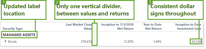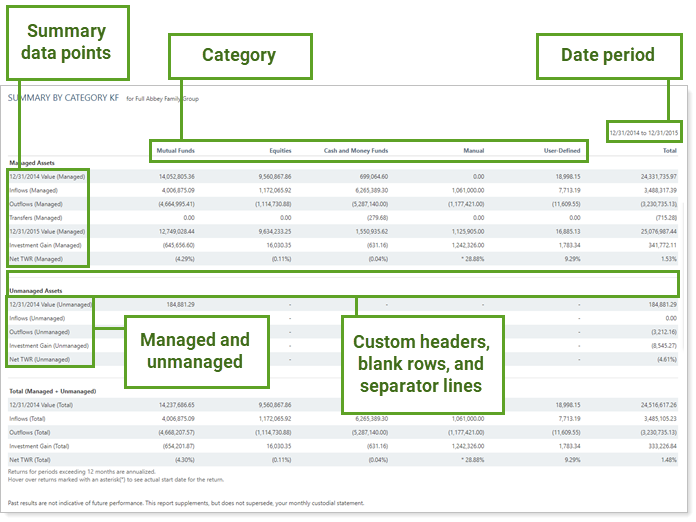 When you report managed and unmanaged assets separately, the Managed Assets and Unmanaged Assets labels and associated accounts and benchmarks have been moved to group related data together.