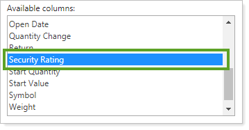 Security custom fields. We know how useful security custom fields are for displaying descriptive features of securities such as rating, market cap, or liquidity. That's why we've made them available on the dynamic Position Performance report. You'll find security custom fields among the available data points in the available/selected list.