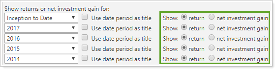 When you select Show: net investment gain, the report always displays net investment gain, regardless of other settings. For more information, see Show Return or Net Investment Gain.