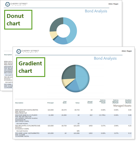We know you like having the option to set your Asset Allocation pie charts to display a gradient or a donut chart. That's why we've expanded these features to the Bond Analysis report pie chart. Now you can create Bond Analysis pie charts that have the same formatting as Asset Allocation pie charts, enhancing your PDF reports with consistent branding across all pages.