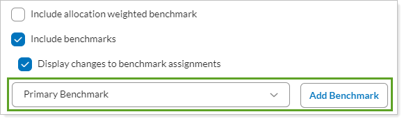 On the PDF report, when you selected Include benchmarks, Benchmark 1 was displayed for separately managed accounts (SMAs). Now you select Include benchmarks and then designate specifically which benchmark(s) you want displayed for SMAs using the Selected Benchmarks list.