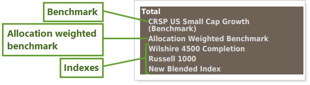 Benchmarks, allocation weighted benchmarks, and indexes are now listed in a consistent order with clearer formatting at the end of the table.