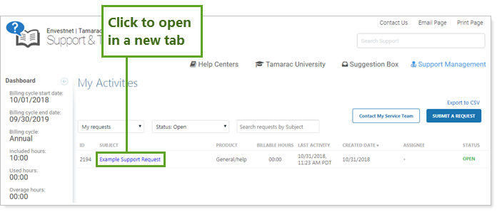 The Support Management dashboard is your hub for knowing what's happening when you've contacted us. The dashboard allows you to find support requests using filters and search terms. In the past, clicking a specific support request made you lose the filtering you put in place to find it.