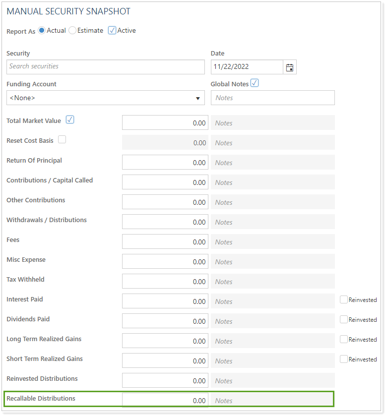 We know that manual security snapshots are an important part of your business and as an advisor, it’s important that you provide as much detail as possible for your clients. We heard your feedback and with this release, you can now add recallable distribution amounts to your manual security snapshots.