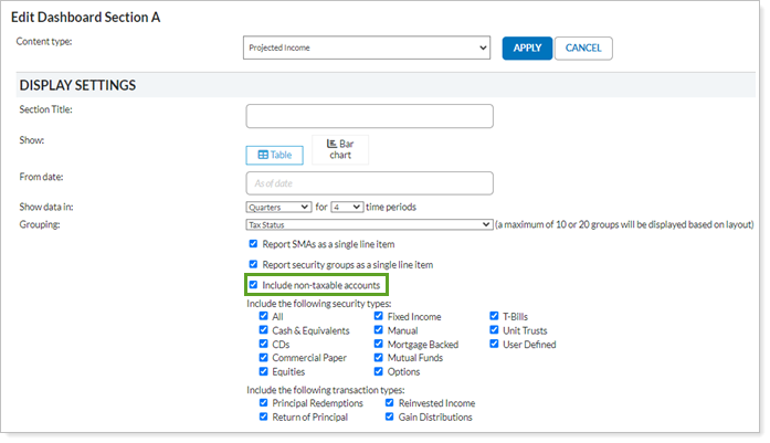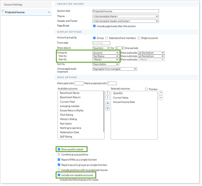 Include positions with no projected income (available on PDF and Dynamic full reports)