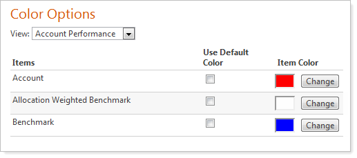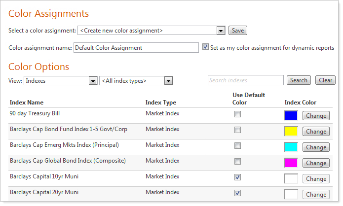 You can even create "color assignments." Color assignments sets of colors that Advisor View will assign to indexes, graphs, and categories. You can then assign these color assignments to your client views and PDF templates. For more information on color assignments, visit Report Themes.