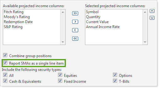 To view SMA projected income at the group level, select the Report SMAs as a single line item check box.