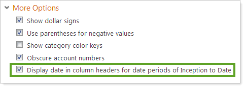 next to More Options and then select the Display date in column headers for date periods of Inception to Date check box.
