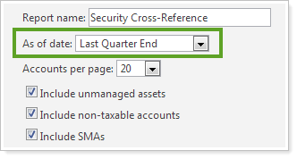 For those of you that take advantage of the Security Cross-Reference, Holdings, and Asset Allocation reports, you'll be pleased to learn that we've added an 'as-of' date to the reports, which will allow you to view historical information for any date. For example, you can run the Security Cross-Reference report to find accounts that held a specific security on a specified date.