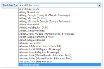 When your client views the Find data for list in their client portals, the most recently viewed accounts will now appear at the top of the list. If more than 10 accounts appear, the client can now click >> Next accounts to view the next 10 accounts.