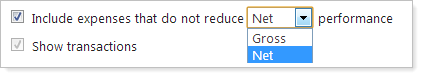 To enable this option, in the report settings for the Capital Flows report, select the Include expenses that do not reduce Gross/Net performance check box and then choose Gross or Net in the list.