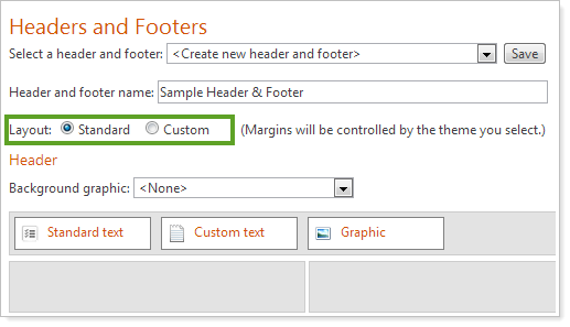 We think you'll find the new headers and footers are easier to use and offer many new features that you'll want to take advantage of. But if you're not quite ready to make the switch, you can still create headers and footers the previous way by choosing the Standard layout.