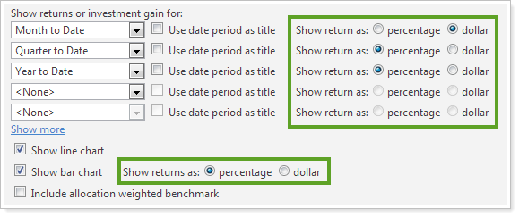 For each date period and chart, click Percentage to show the returns as a percentage or Dollar to show the returns as a dollar amount.
