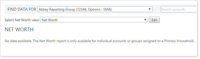 Sometimes when running the Net Worth report, you may receive the informational message, "No data available. The Net Worth report is only available for individual accounts or groups assigned to a Primary Household." This message may display when the account is assigned to multiple Households, but it has not been assigned a primary Household.