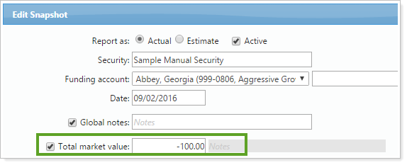 To support this scenario and many others, when entering the total market value for your manual securities, you now have the option to enter negative values. To enter a negative value, simply type a dash before the number in the Total market value box.
