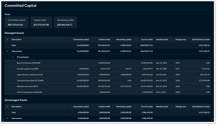 On the page, you’ll find all the familiar features you use on the Committed Capital report in Tamarac Reporting—multiple grouping options, managed and unmanaged assets, and more.