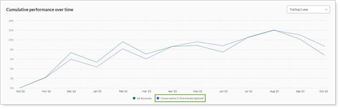 Account Performance. Clients can see the category-level and allocation-weighted benchmarks in the chart and table.