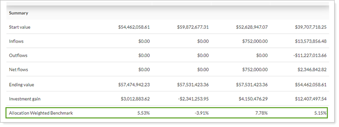 Summary. Clients can see the allocation-weighted benchmark in the table.