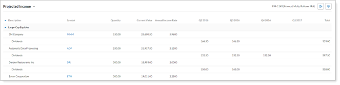 On the Projected Income report, we've made it easier to identify when interest and dividends were paid for each security. Now you can break interest and dividends out into separate rows under each security for greater detail. If you'd like to continue seeing the report as it's always been, with the interest and dividends combined in the same row with the security, select the new Combine interest and dividends setting. This is the default setting.