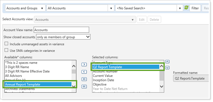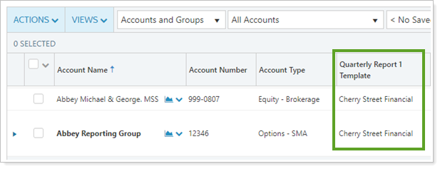 In the November release of Advisor View, we delivered template types, which allow you to create more than one default template. With this release, we've updated the Accounts page so that you can see the default templates assigned to your accounts and reporting groups. Each Template Type will appear as an available column for the Accounts page and you can choose which ones you want to see on the page. Note that in this list, each template type will have "Template" at the end of the name, even if that isn't part of the name you used for your template type. For example, if you had template types named "Q2 Report" and "Annual Report Template" they would both end in "Template", as shown below: