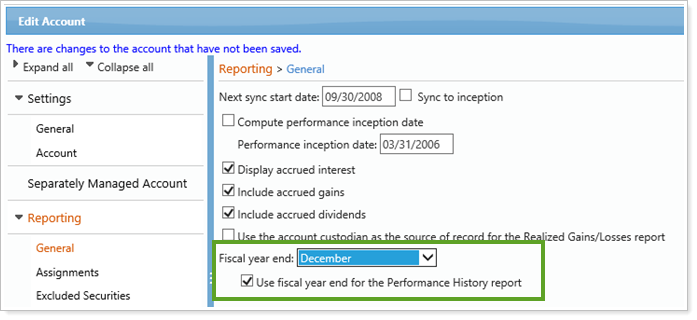 You can use the fiscal year end date for the categorization on the Performance History PDF report. This option is available for each account, and you can select it in the Edit Account window. You will be able to set the fiscal year end month, then select the Use fiscal year end for the Performance History report check box. You will not see fiscal year mentioned on the report, but the quarterly and annual date periods will be adjusted to match your fiscal year.