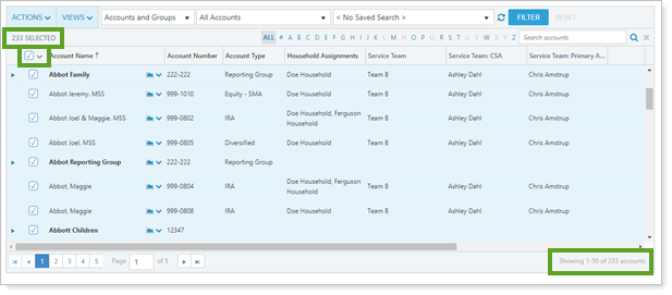 If you click the check box in the header row, you will select all accounts on the page—not all accounts within Advisor View. To select all accounts that are returned from your current filters, click the link on the right side of the page that lists the number of total accounts.