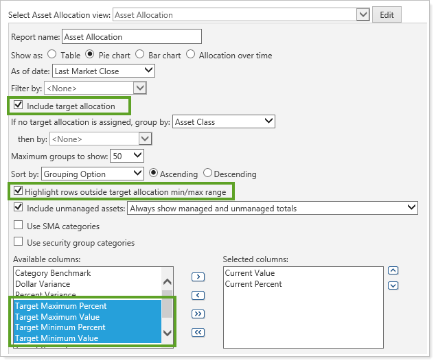 For your Asset Allocation reports, you now you have complete control over which columns are included in your report and what order the columns are in.