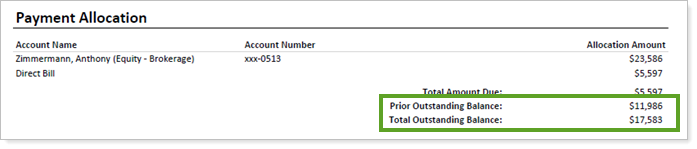 To include the prior outstanding balance and total outstanding balance on your billing statements, go to the Detail Statement Display Options section on the Billing PDF template and add a Payment Allocation section. Then select the Include prior outstanding balance and Include total outstanding balance check boxes.