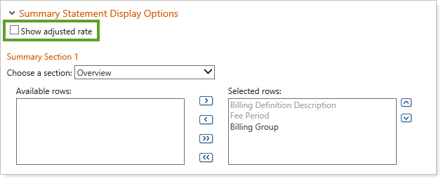To hide your adjusted rate, clear the Show adjusted rate check box in the Summary Statement Display Options section of the Billing PDF template section.