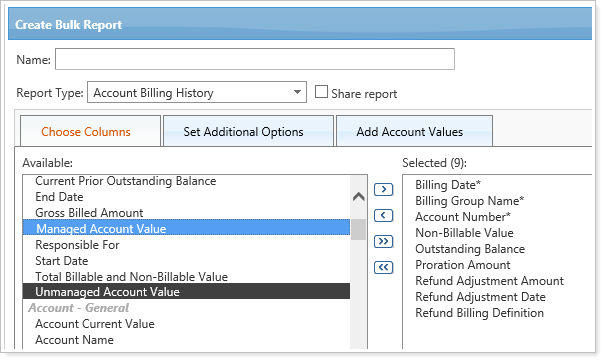 You can also add these columns when you create the Account Billing History bulk report, and you can make later adjustments, if needed, on the Edit Bulk Report page.