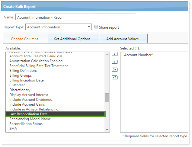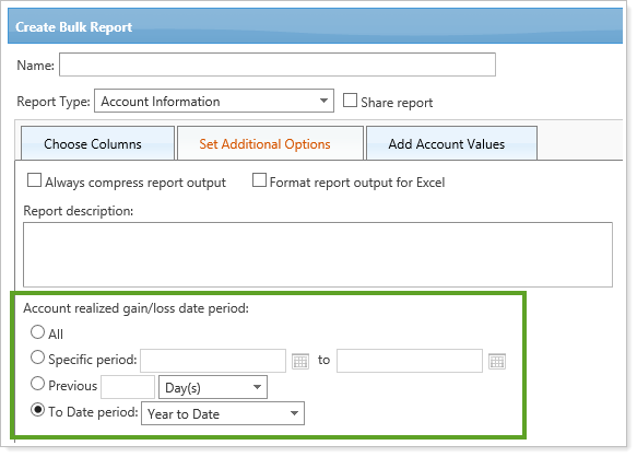 We have provided you with more options for tracking gains and losses on the Account Information bulk report. When you create this bulk report, you can set a date period for your realized gain/loss values on the Set Additional Options tab, and include the following new columns: