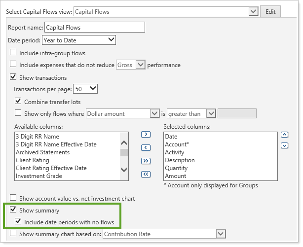 If you select the Include date periods with no flows check box when you edit the Capital Flows report, clients will see any applicable date periods as $0 for contributions and withdrawals if there were no flows in the summary. If you clear this check box, they will be omitted from the summary. With this release, all PDF reports will have this check box selected by default, and dynamic reports will have it cleared. The option is only enabled when the Show summary check box is selected.