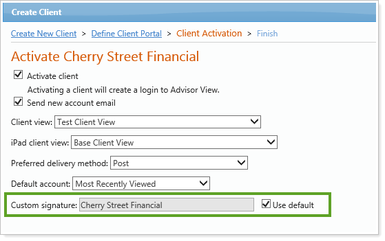The default custom signature is then available when you create a client. You can select the Use default check box at the end of the Create Client wizard (and you will be able to change this signature later on the Edit Client screen, if needed).