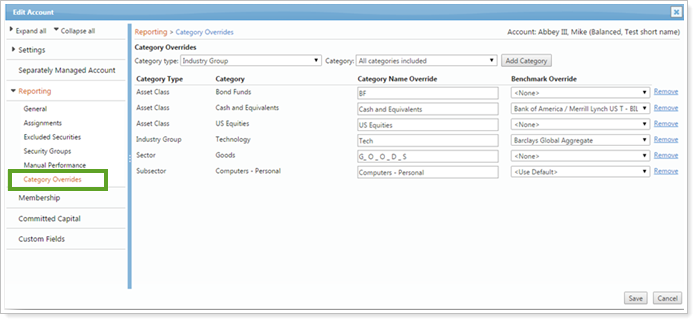 We added the option to rename any category or benchmark for any individual account or reporting group. Your changes will be shown only on that account or reporting group's reports. For example, Client A may want their reports to display ‘Equity,' and Client B may want their reports to display ‘Stocks' for the same category.
