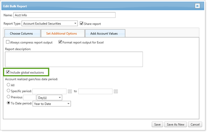 By default, both global and account level security exclusions are shown in your Account Excluded Securities bulk report. Now you can choose whether global options are included, or whether only the account level exclusions are shown. To set this option, select or clear the new Include global exclusions check box on the Set Additional Options tab of the Edit Bulk Report page.